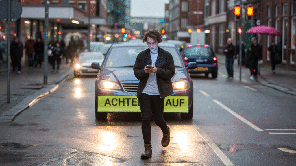 • GER: Bitte achte auf den Verkehr, wenn du die Straße überquerst.