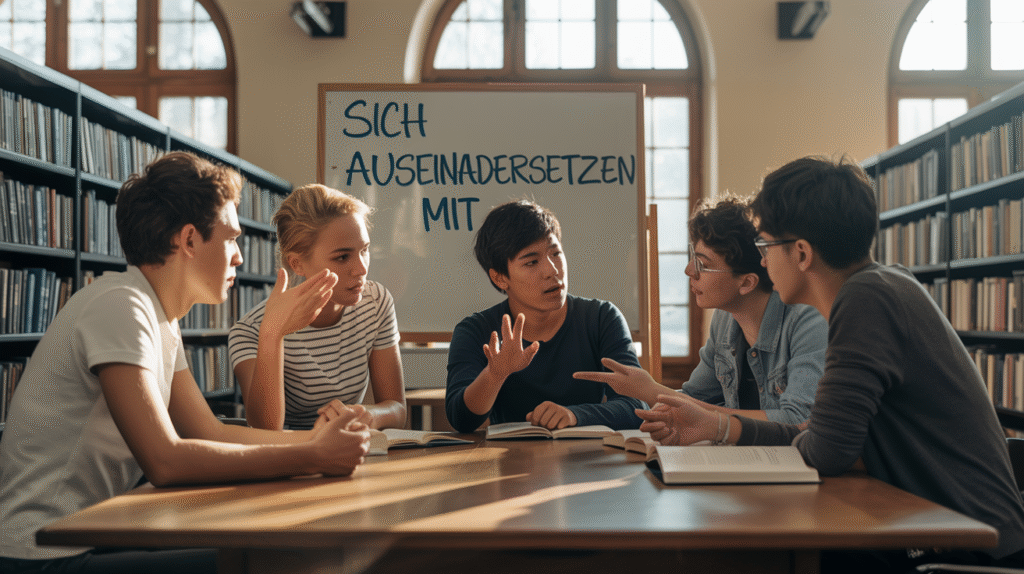 sich auseinandersetzen mit (+ DAT) — to deal with; engage with